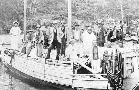 萩港から海上45qの見島。今年元日の朝、島の空高くあがる鬼揚子の勇姿がNHKテレビで全国放送された。その縁起凧を船名にした萩−見島間の高速貨客船「おにようず」の就航は一昨年4月、所要時間を一気に1時間10分に縮めた。見島は古代から防人の島として重んじられ、船便はひらけていた。写真の2本マストの帆船は大正5年(1916)7月、見島小学校新築落成式に出席する黒金泰義知事(ほぼ中央黒チョッキ姿)をのせ島についたところ。5年後には動力船大正丸が就航した。