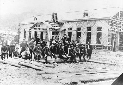 日本の鉄道の父・井上勝を生んだ萩だが、初めて長門三隅ー萩駅間に鉄道が開通したのは大正14年(1925)4月と遅かった。写真はその開業に向けて建設の進む萩駅舎と工事関係の人たち。萩ー東萩間は同年11月、益田まで全通して名称が山陰線になるのは実に昭和8年(1933)である。鉄道が主役をつとめたのも昭和40年代までで、54年に無人駅となった。しかし、大正建築の美しい姿をとどめる建物は平成8年(1996)、登録文化財に指定、改修されて自然と歴史の展示館になった。井上勝の鉄道一筋の生涯が紹介されている。 |