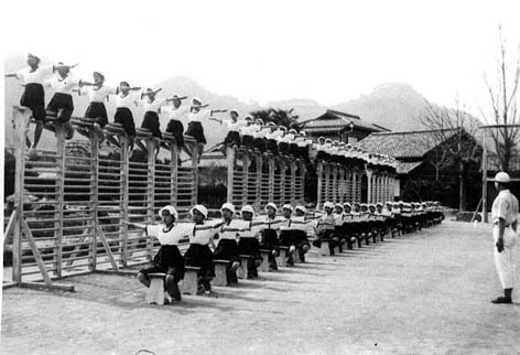 椿西小学校女子児童の見事な肋木体操(濁淵、昭和初期)