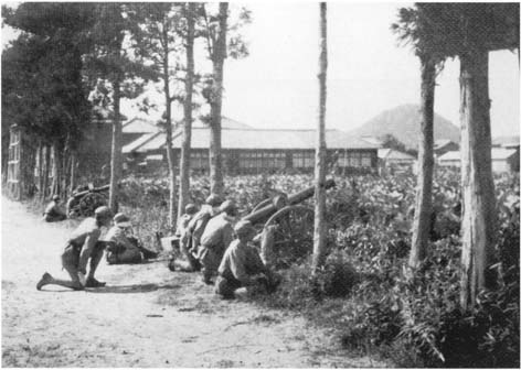 山砲は山地でも使いやすいように分解して運搬できる火砲。杉木立があって右手がハス田の写真の場所は萩商業学校の敷地内。今も萩商業高校と明倫小学校の境界沿いで、右手同じところに指月山が見えている。生徒たちの訓練は実弾射撃ではなかったろうが、60数年前、萩の真ん中でこんな光景があったとは信じられないほどだ。中等学校での軍事教練は昭和6年(1931)の満州事変以来、一段と強化され、この年、山口市で県下中等学校生徒射撃大会が開かれ、12月、萩商4・5年生は武装して山口連隊まで徒歩行軍し、3泊4日の兵営宿泊訓練を行った。 |