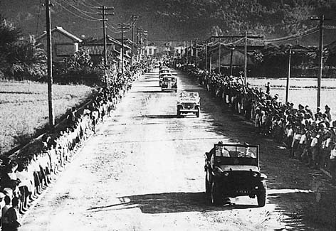 あの暑い夏の終戦の日から2カ月余、10月27日、米占領軍の赤い矢(レッドアロー)部隊115人が、山口から萩へ車で進駐してきた。市長をはじめ多数の学童や市民が出迎える中、部隊は椿東椎原の萩修練道場に入る。写真は萩駅前の道を北上する米軍だが、画面からは人々の息をつめたような緊張と静けさがうかがえる。子どもたちの服装は貧しく、足元を見ると、裸足や草履の子もいるかのようだ。戦後の日本そして萩はここから始まった。正面に見えるのがドーマーウィンドウが印象的な当時の国鉄萩駅。今も昔のままで改築され、国の登録文化財「萩市自然と歴史の展示館」として保存・活用されている。 |