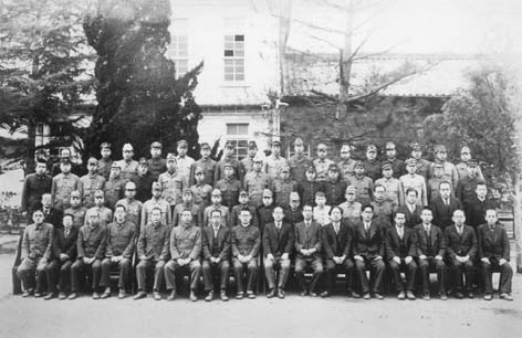 終戦から半年余、卒業生たちの格好はまちまちで学生服はむしろ少なく、戦闘帽が目立つ。このうち7人が予科練(海軍飛行予科練習生)帰り、12人が戦災や外地引き揚げの転入生、他の全員も半年前まで勤労動員で光の海軍工場に駆り出されていた。工場ではヒジキや大豆かす入りの貧弱な飯で働き、食べ盛りの少年たちは栄養失調になり、2人が死んだという。米軍機の爆撃も受けたが幸い死者はなかった。実はこの写真の45人は特例として認められた4年での繰り上げ卒業を選んだサムライたちである。母校の同窓会長もつとめる萩商工会議所会頭・山縣喜一、千二百年式年大祭を迎える春日神社宮司・津村和彦らの顔がある。 |