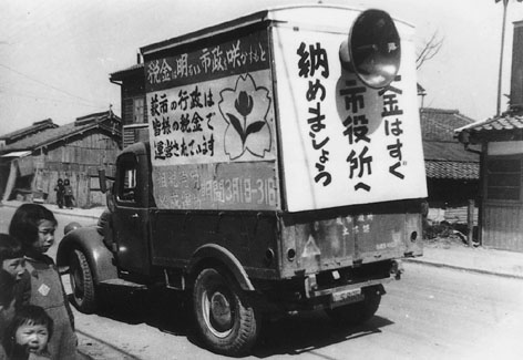 戦後日本の大テーマは民主化だった。そのためには市民へ情報を流し、理解してもらわねばならない。萩市も市役所土木課の小型トラックに看板と拡声器をとりつけ、ことあるごとに広報活動に走らせた。写真は3月の「租税完納必成運動」で「税金はすぐ市役所へ納めましょう」「税金は明るい市政を咲かすもと」と呼び掛けている。写っている子供たちの服装も家並も戦後の貧しさからまだ抜け出していないかのようだ。さて、平成13年の今、萩市役所には税務、水道、下水、保健センターなど部門ごとに11台の広報車がある。狭い道が多いから、半数は軽自動車という。先日、その1台に「こんにちは国保です。納めて安心 国保料」とあった。 |