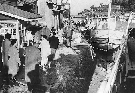 この年、1960年11月7日、相島の相島小中学校(当時)で山口県へき地教育研究会が開かれた。これより6年前の昭和29年にへき地教育振興法が出来ていた。相島は浜崎港から北西14ワの沖にある。写真は同港から島行きの船に乗り込もうとしている先生たち。ロングコートのさっそうとした女性教師の姿が印象的だ。前の年市長に就任した菊屋嘉十郎も研究会に出席したという。1960年は安保闘争や三井三池争議など騒がしい年だったが、高度経済成長のただ中にあって国全体に活気がみなぎっていた。相島は名物スイカやタバコ、イモ、タマネギを産出して今も元気である。なお、離島航路の船着場は現在よりずっと南、今の渡し場あたりだった。 |