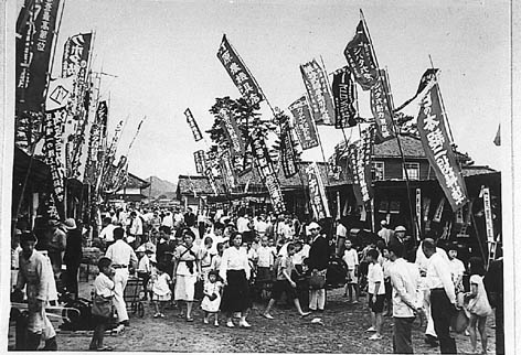 この写真はいつごろ、どこで撮られたものなのか特定できない。展示会場の背景に学校の校舎のような建物と高い松の木が写っている。市内のどこか学校のグラウンドだろうか。それにしても、この派手々々しく農機具メーカーや販売店ののぼりが林立した賑わい・活気はどうだろう。子どもの姿も多く、まるでお祭りの雑踏である。のぼりに「クボタ」とか「シバタ式」とか「竹原農機具店」とか、あるいは「ストロング」や「審査最高第一位」などの文字が読み取れる。この写真は少なくとも、今よりは農業がずっとずっと元気だったころだ。日本の農業は高度経済成長の進展に逆比例するかのように、昔の活力を減らしていった。それが、何より残念である。 |