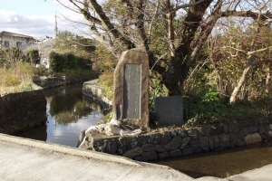 ![]() | 【第8回】 竹内八郎歌碑 善福寺から100メートルほど行くと、藍場川が小さな溝と分流する地点があります。ここには大きな桜の木があり、その下に竹内八郎の歌碑が建っています。この歌碑には、「家ごとに池を構えて水を引き朝夕清き藍場川流る」と、藍場川の情景が歌われています。今でも藍場川沿いの家々には、藍場川から水を引き入れた池のある庭が見られます。藍場川の水を利用して生活に潤いを求めた、先人たちの知恵がうかがえます。なお、竹内八郎は浜崎町に生まれ、萩に在住した歌人です。山口県内外の歌会の選者として活躍し、『あらつち』の主管として短歌誌の発展に尽力しました。この歌は昭和41年(1966)の作で、歌碑は昭和48年に建立されましたが、その翌年八郎は74歳で亡くなりました。![]() ところで、ここの桜の木の下には木製の涼み台とベンチが置かれ、藍場川がもたらす風の匂いを感じさせる、恰好の涼み場所となっていました。また、川の中には、ホタルの幼虫の餌になるカワニナが生息しています。かつては、季節になるとホタルがたくさん飛び交っていたということで、ホタル狩りで藍場川沿いを大勢の人が散策していたそうです。しかし今では、ホタルは数える程しか富んでいないそうです。カワニナだけでなく、昭和30年代まではシジミも数多く生息していたそうで、食料として1年中とることができたということです。さらに、ウナギをとったり、アユやテナガエビや海から上ってきたボラを網ですくったりすることもできたそうです。藍場川は多くの魚たちの生息場所ともなっていましたので、英語で「魚とりの大様」と称された宝石のように華麗な水鳥、カワセミが頻繁に飛んで来ていたそうです。 このように自然環境に恵まれた藍場川では、子供たちが泳いだりする光景が普通に見られ、水と親しむ遊びの空間でもありました。 (市報はぎ1996年11月15日号掲載)