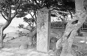 米屋町下り筋を通ると、検察庁前庭の樹立の間に玄武岩の台石の上に載せられた安山岩(萩地方に産する赤ボ石と同質)の高さ一七〇センチメートル、幅五〇センチメートルの石碑が建っている。表面の達筆に書かれた「練兵場」の三文字は彫りも深く、萩にある石碑の文字としては最大級のものに属し、気迫に満ち誠に雄渾である。筆者の名はないが、おそらく当時明倫館書道師範であった草場真蔵の書と思われる。 この石碑は藩政時代の明倫館差図や八江萩名所図画にも描かれており、当時から同所に建てられていたものであることがわかる。現在は検察庁の新改築に伴い、二度ほど少し右に移された位置にある。 練兵場は藩校明倫館内の西北端に位置し、三千坪の広さを持っていた。中央に広大な広場を設け、その西に正門をはさんで稽古場と器械方役所の建物があり、南には周発台稽古場、御覧所等があった。東方には石垣の射的が造られており、的場に向かって小銃を撃ち、大砲の操作は形だけを教えていた。 ![]() 練兵場の教育は、明治維新に際し結果的には萩蕃が討幕戦に活躍する軍事的基礎を養うことになるのであって、その歴史的意義は、この練兵場跡に残された石碑によって語ることができる貴重な遺跡である。 |