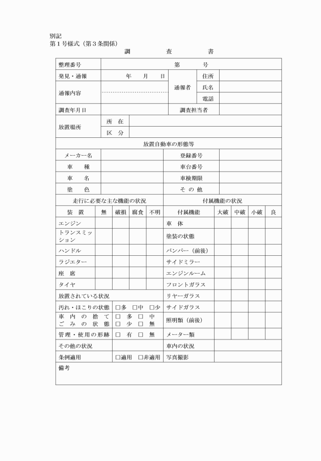 第16条 市長は、放置自動車の処理に関する事項を記録するため、放置自動車処理記録台帳(別記第13号様式)を備えるものとする。