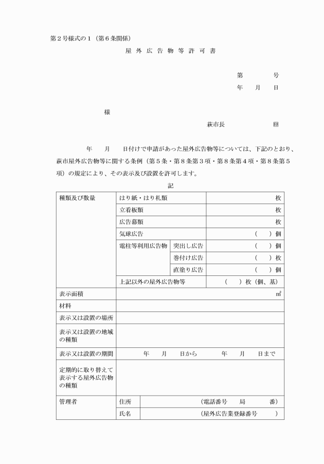 第1条 この規則は、萩市屋外広告物等に関する条例(平成20年萩市条例第5号。以下「条例」という。)の施行について必要な事項を定めるものとする。