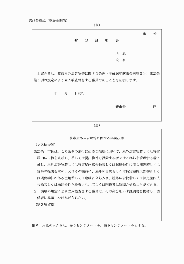 第18条 保管した屋外広告物等を売却する場合の競争入札又は随意契約の手続きは、萩市会計規則(平成17年萩市規則第44号)第7章の規定の例による。